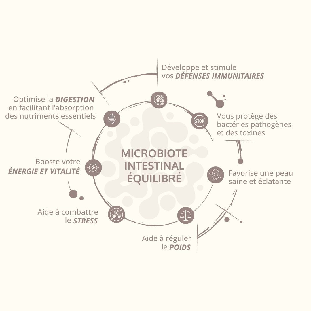 - un système immunitaire fort : un microbiote équilibré stimule les défenses immunitaires, vous protégeant ainsi contre les infections.