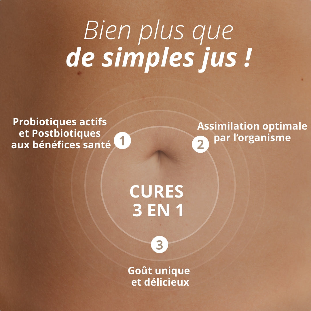 Notre équipe d'experts en nutrition et en microbiologie a conçu et fabriqué des cures de jus de fruits et légumes bio, 100% naturels, enrichies en probiotiques vivants grâce à un procédé exclusif de fermentation. Ces probiotiques ne se contentent pas de restaurer l'équilibre de votre flore intestinale, ils produisent aussi des postbiotiques, des composés essentiels qui renforcent la barrière intestinale.